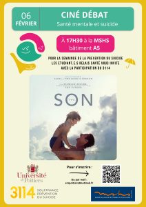 Les étudiant-es relais santé organisent le 6 février à partir de 17 h 30 à la MSHS un ciné débat sur la santé mentale et la prévention du suicide.