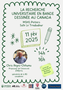 Le mardi 11 février nous accueillerons Chris Reyns-Chikuma, professeur de l’Université d’Alberta, spécialiste de la bande dessinée canadienne à la MSHS en salle Troubadour (14h-16h). Il nous présentera ses recherches sur les bandes dessinées du paysage éditorial canadien.