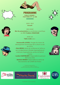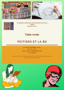 Le Réseau Régional de Recherche Nouvelle-Aquitaine en BD est heureux de vous présenter une première table ronde sur « Poitiers et la BD » le jeudi 30 septembre à partir de 10h jusqu’à midi, à la MSHS de Poitiers, Salle des Conférences. A cette occasion nous ferons un premier tour de table de personnes qui travaillent autour de la BD à Poitiers, qui sera le premier volet et ouvrira des pistes de réflexion.